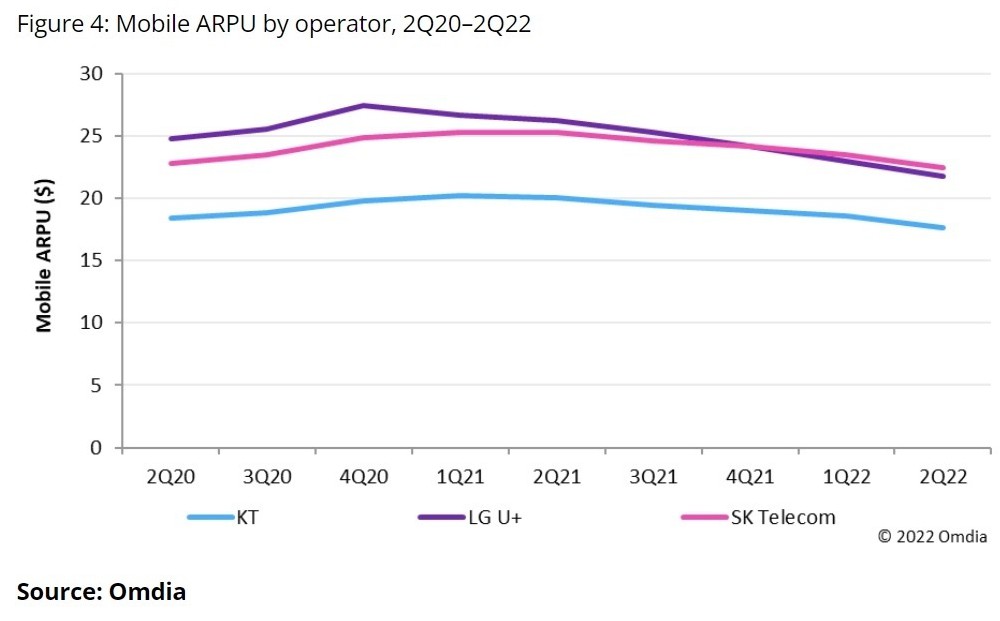 浏览次数:143市场研究公司Omdia一份报告称韩国5G运营商的每用户销售额ARPU在经历一段时间上升之后开始下降。Omdia分析师Anshika Gandotra在报告中称,经过两年多的持续增长,韩国电信KT, LG U+的移动ARPU都开始下滑,相比之下SK电信还保持持平,5G的用户数增长和销售收入增长都开始停滞。在韩国,5G的推出一度阻止了ARPU的下滑,但是从2021年1季度以来,移动运营商APRU又开始下滑,这期间尽管运营商也采取了不少措施,比如SK电信一度将部分5G资费下调百分之三十。